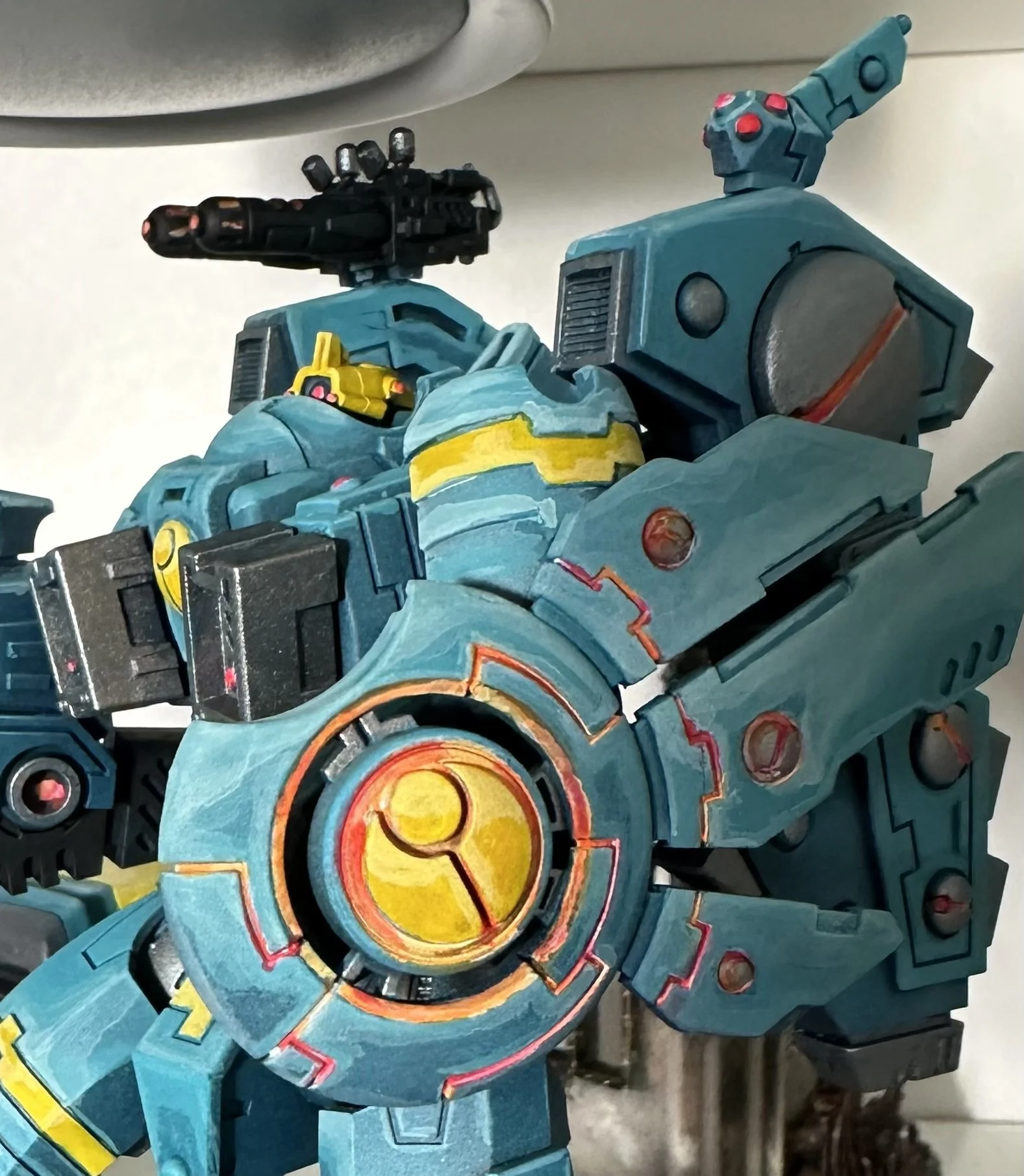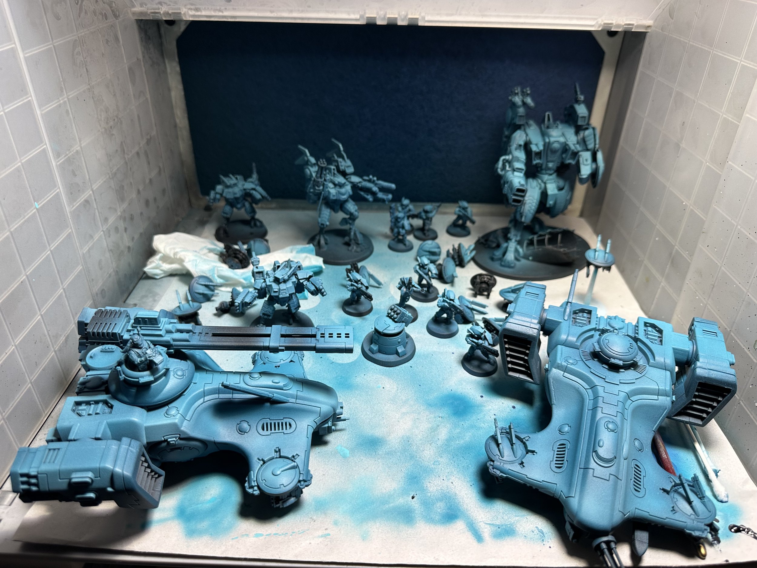 I’m finally reaching a stage where I can say this project is shaping up to be a real success. All the miniatures have their base colors and first highlights done with the airbrush (Army Painter Air paints are working out well and my initial horrors of Airbrush clogging belong to the past), the Riptide and Devilfish are complete, and I’ve started working on the Breacher Team.