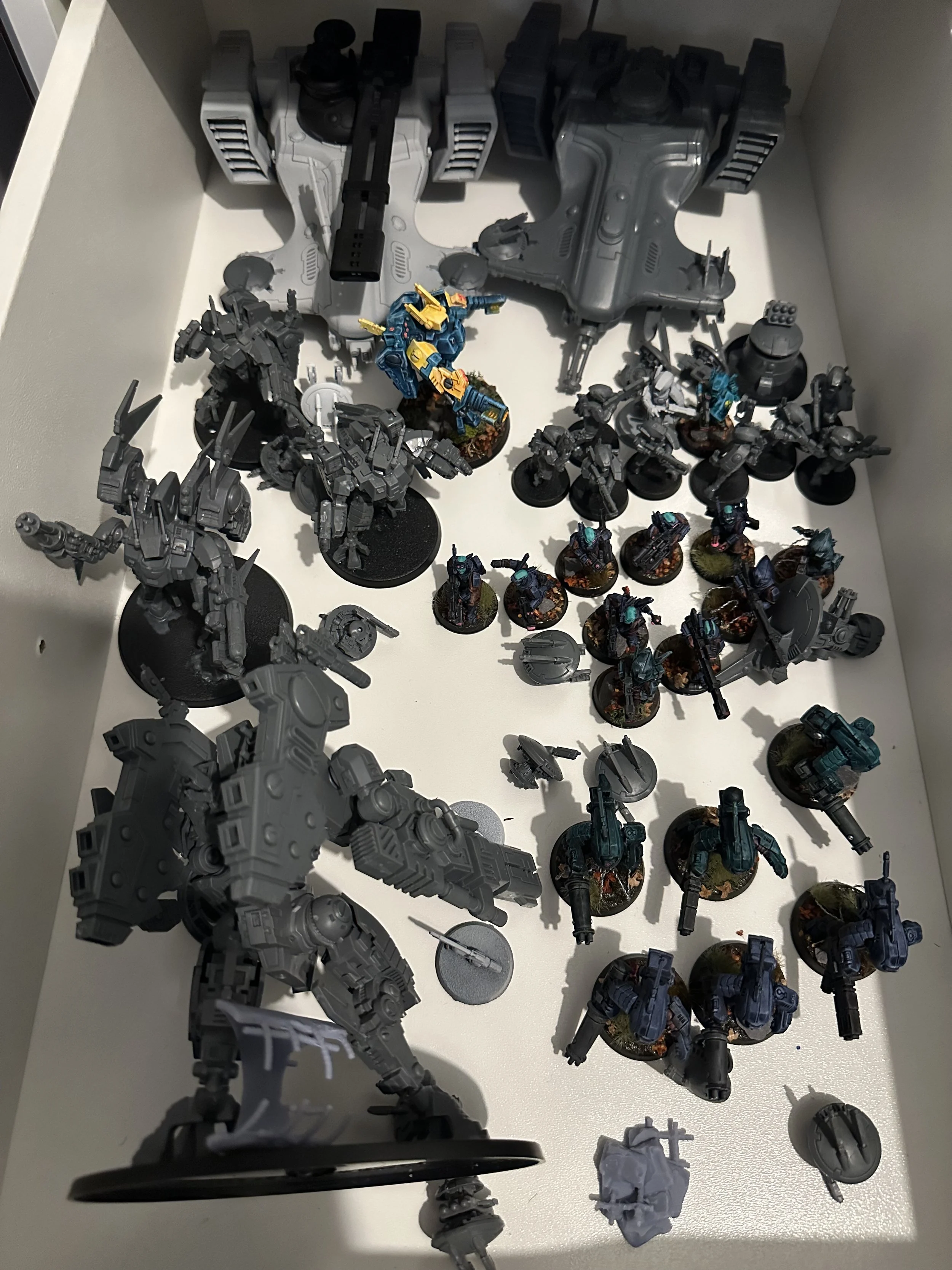 Since I already collect Tau built and painted some, there was kind of a ground groundstock but to hit 1,000 points, I needed to build a commander, a breacher team, a Devilfish, some Crisis Suits, and of course a ridiculous number of drones. Building? Done.